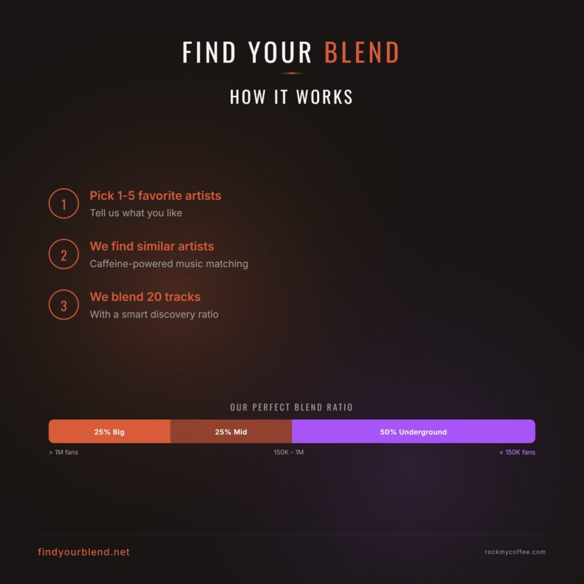We find similar ones using a ratio of 25% big bands, 25% « mid » bands, giving you the satisfaction of reconnecting with possible old favs and 50% small bands to make sure you find new stuff. A little bit of love, a good pour of liquid caffeine and boom, you get your 20-track blended playlist. Simple as that really.